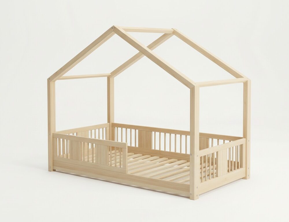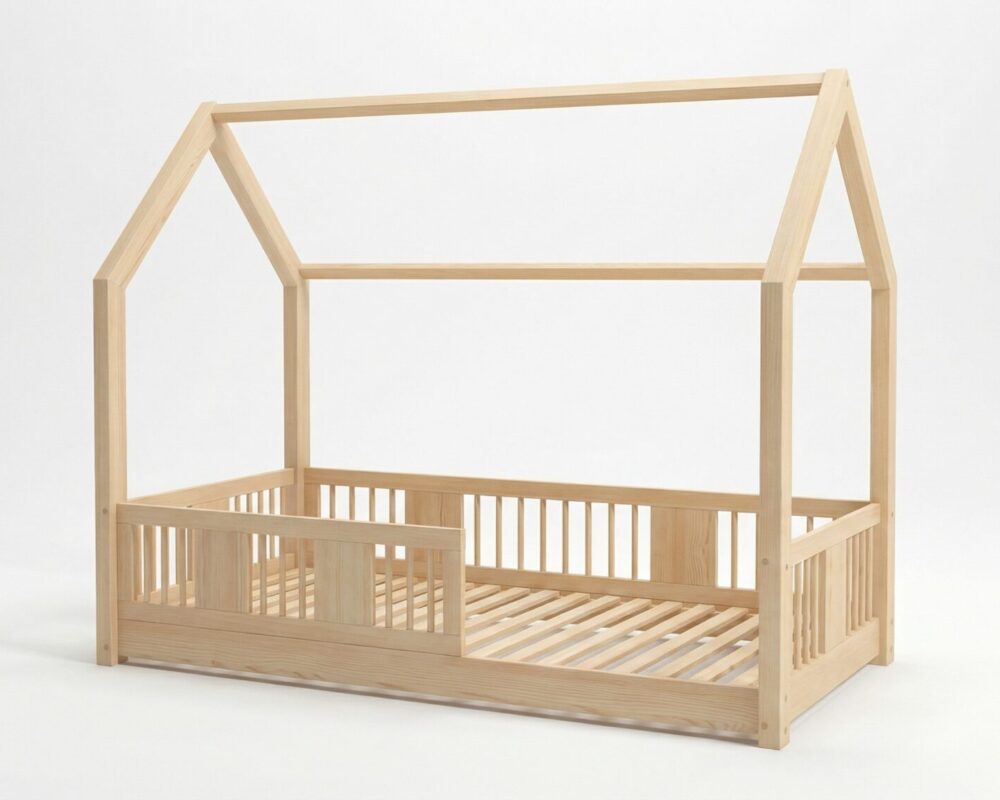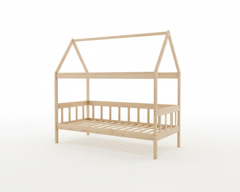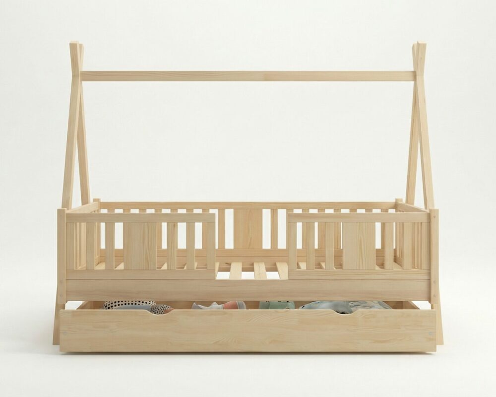 ASTRIA med skuffe er en unik enkeltseng i husform, der kombinerer funktionalitet, holdbarhed og eventyrlig charme. Takket være den forhøjede konstruktion på 20 cm høje ben får denne model en ny dimension af praktisk anvendelighed – under sengen kan der placeres funktionelle skuffer, som hjælper med at holde orden på børneværelset eller giver en ekstra soveplads. Den fuldt ud naturlige konstruktion i fyrretræ garanterer holdbarhed, sikkerhed og et enestående udseende. Det karakteristiske trætag giver helheden en helt særlig atmosfære – det skaber et rum, hvor søvn, leg og fantasi smelter sammen hver dag.