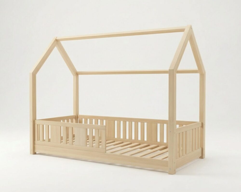 STELLIA med skuffe kendetegnes ved et karakteristisk langt tag i husform, som skaber en særlig hyggelig atmosfære på børneværelset. Trærammen med det fine tag forvandler en almindelig enkeltseng til et magisk sted – et rum, hvor søvn, leg og afslapning smelter sammen til én helhed. Takket være den forhøjede konstruktion på 20 cm høje ben får denne model en ny dimension af praktisk anvendelighed – under sengen kan der placeres funktionelle skuffer, som hjælper med at holde orden på børneværelset eller giver en ekstra soveplads. Den fuldt ud naturlige konstruktion i fyrretræ garanterer holdbarhed, sikkerhed og et enestående udseende. Det karakteristiske trætag giver helheden en helt særlig atmosfære – det skaber et rum, hvor søvn, leg og fantasi smelter sammen hver dag.